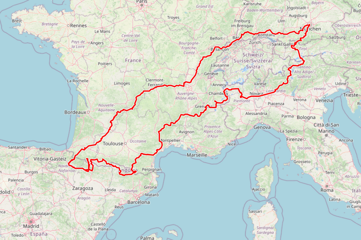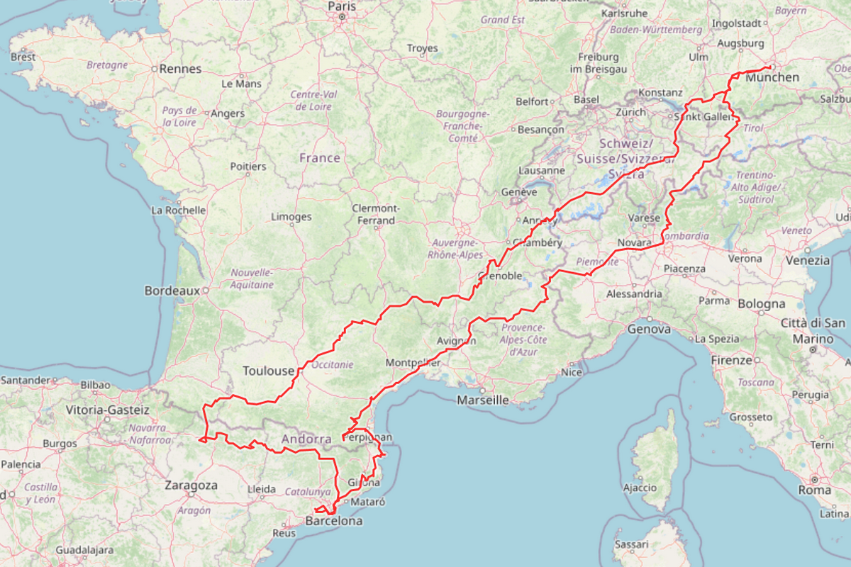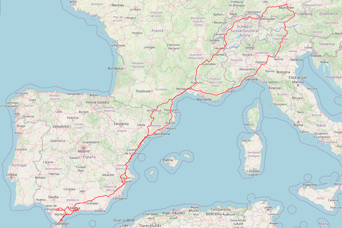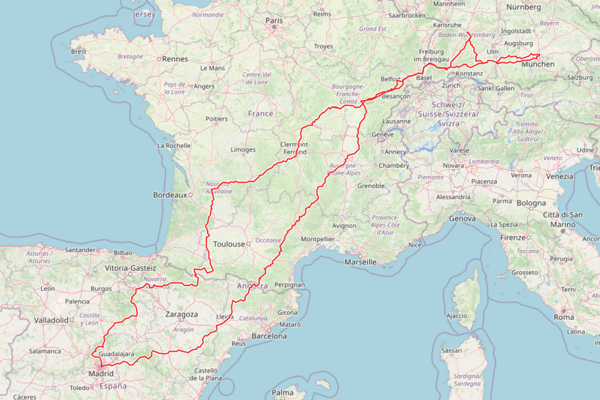 That trip has a special place in my heart. Born as just a crazy idea, I ended up riding my bike all the way down to southern Spain to meet my wife for our annual vacation. Didn’t have much riding time and almost no knowledge on tour planning, I spent far too much time on highways with several days doing more then 600km … Wouldn’t do it again like this, but I enjoyed every minute back then.โ