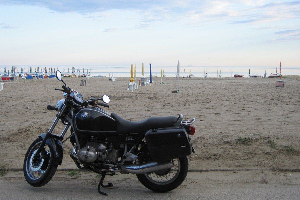 Having found out that my 2007 Triumph Bonneville with a range of only about 200 km was not the ideal long-distance bike (surprise!) I bought a 1991 BMW R 100 R in 2009. Paralever and cardan shaft, 24 liters of gas, panniers and an engine even an agricultural machinery workshop could repair without ordering original parts guarantee for smooth long-distance trips. Time to head for the beach ๐โ